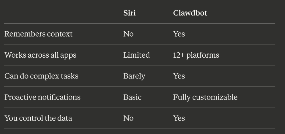 ChatGPT是个聊天框;Clawdbot是个活在个人生活里的助理。Siri的记忆力跟金鱼差不多;Clawdbot是真的有脑子。