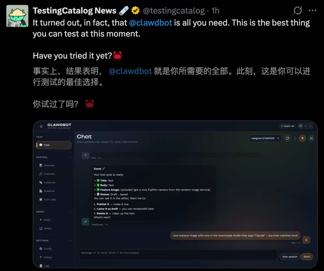 他惊叹地表示,「再过几个月,Clawdbot估计不论什么规模的生意,都能管得转了」。