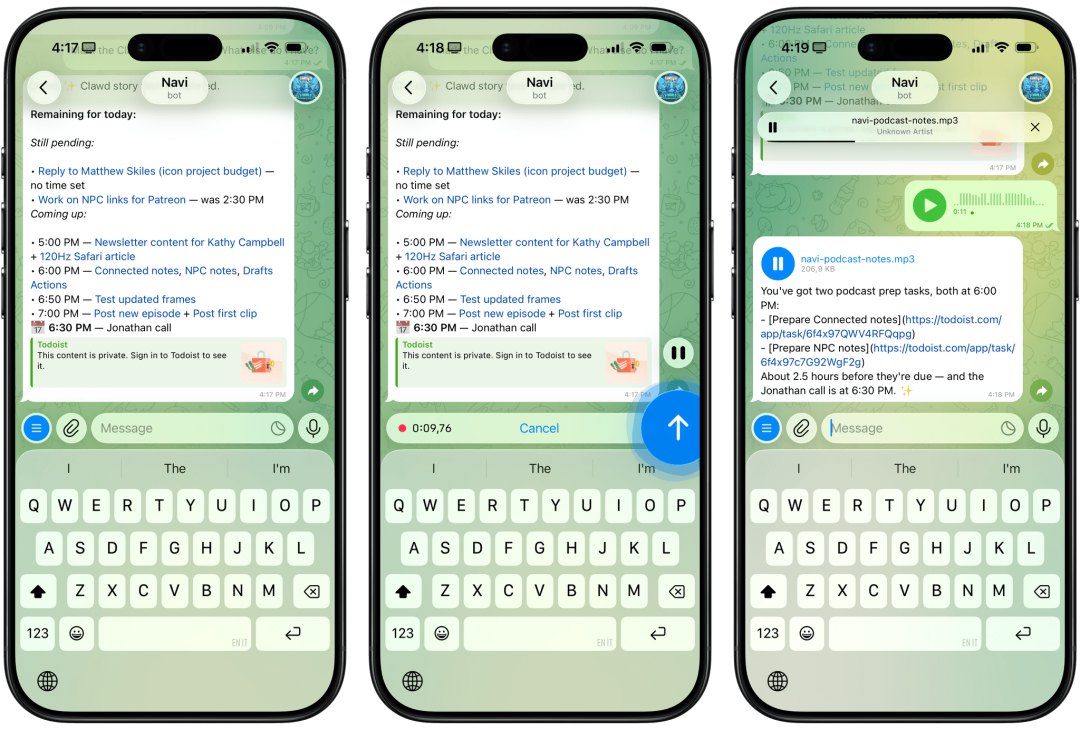 高端骚操作: 有个用户让Clawdbot写冥想词,用AI语音生成音频,配上背景音乐,每天早上准时发给他。全程100%自动化。