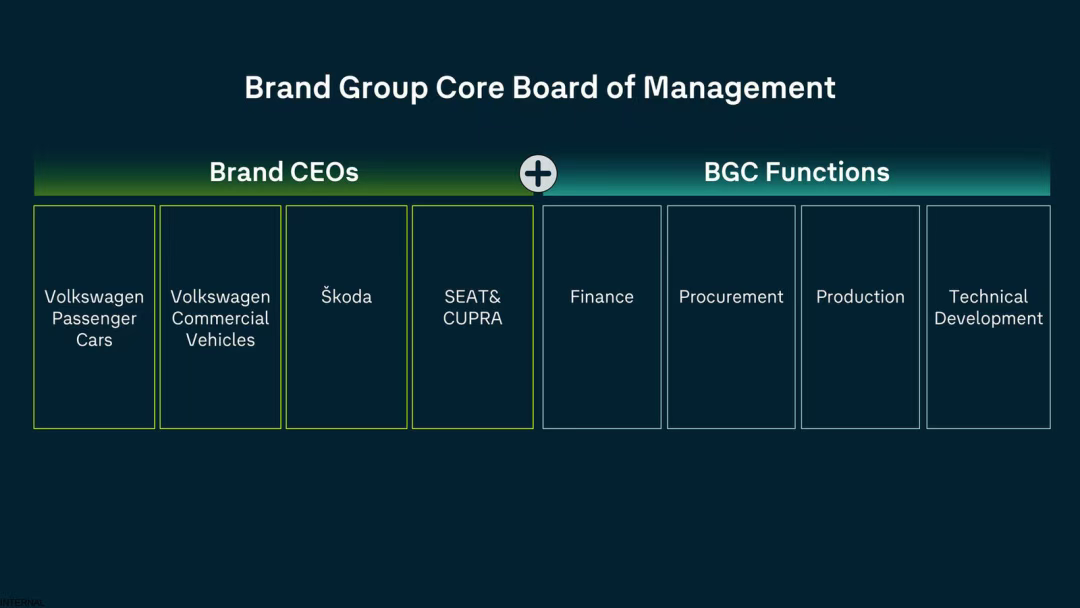 包括,现有的9名负责生产、采购和研发的前董事会成员将被降职,调任至董事会以下的岗位,这是因为以后各个品牌的研发、采购、生产等这类的职能,不再归属于各个品牌,而是集中由德国沃尔夫斯堡总部统筹,由新成立的品牌核心管理委员会(BGC)在跨品牌层面进行管理。
