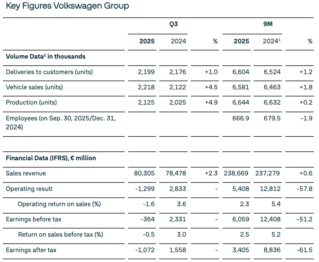更严重的是净亏损10.72亿欧元,去年同期净利润还是15.58亿欧元,同比下降约168.8%,这也是近五年来大众汽车的首次季度亏损,今年前三季度,大众汽车集团净利润与上年同期相比大幅下降61.5%,至34亿欧元。