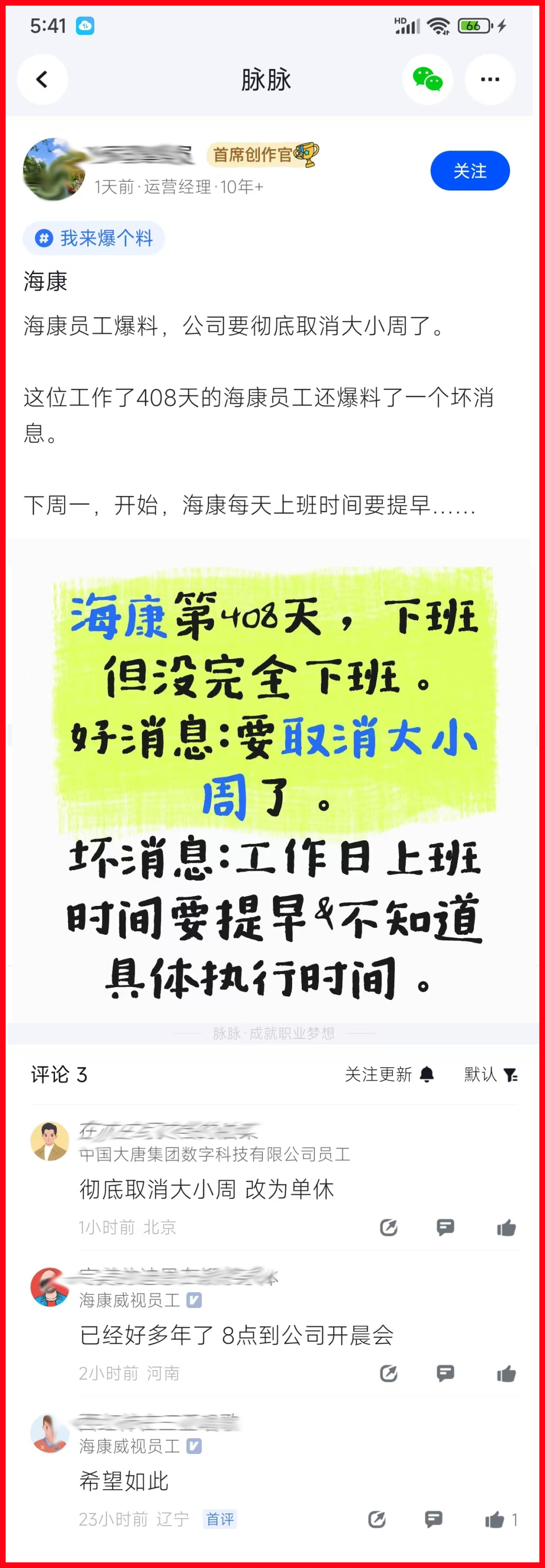 但在职场社交平台上,现实中的该公司员工却展现了另一面。对于大小周制度,他们早已习以为常,却又不满于其不合理之处。