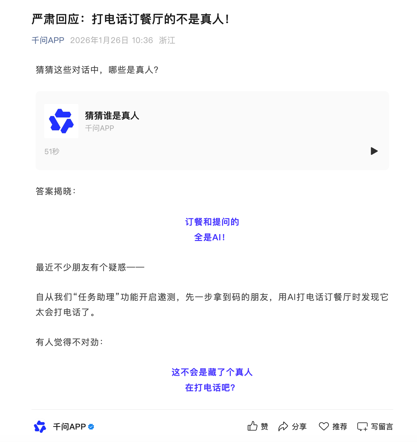 AI电话订餐功能被质疑有真人 千问官方回应 凤凰网科技讯 1月26日,近日,千问App全面接入淘宝闪购、高德等阿里生态业务,并推出AI外卖功能。只要给千问App下达一句话指令,就能完成订餐。 该功能上线10余天后,不少网友发文质疑:“AI打电话订餐厅功能背后肯定有很多真人。” 对此,千问官方发文表示,打电话订餐厅的不是真人。AI打电话说话有停顿、有语气,甚至还能听出点“人情味”,背后是实时情绪与意图识别引擎。它能在100毫秒内识别超过50种复杂情绪,并实时匹配最优的共情话术。 千问还表示,目前定制自己的打电话声音、说外语订餐厅等功能正在开发中。 Published by 风君子 独自遨游何稽首 揭天掀地慰生平 View all posts by 风君子