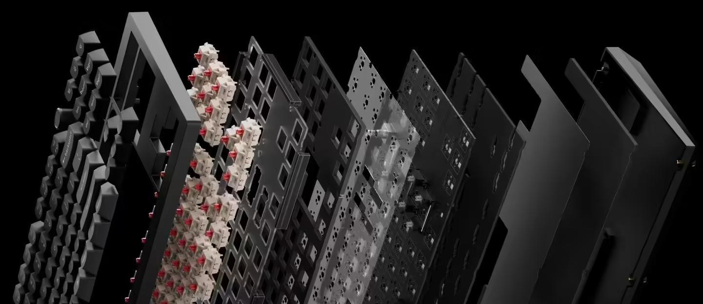 Keychron V Ultra 8K 外部配备旋钮和两段式脚撑,内部具备五层声学阻尼,PCB 支持热插拔和南向 RGB 背光。此外其在有线与无线模式下均可实现 8000Hz 回报率,内置电池容量 4000mAh。