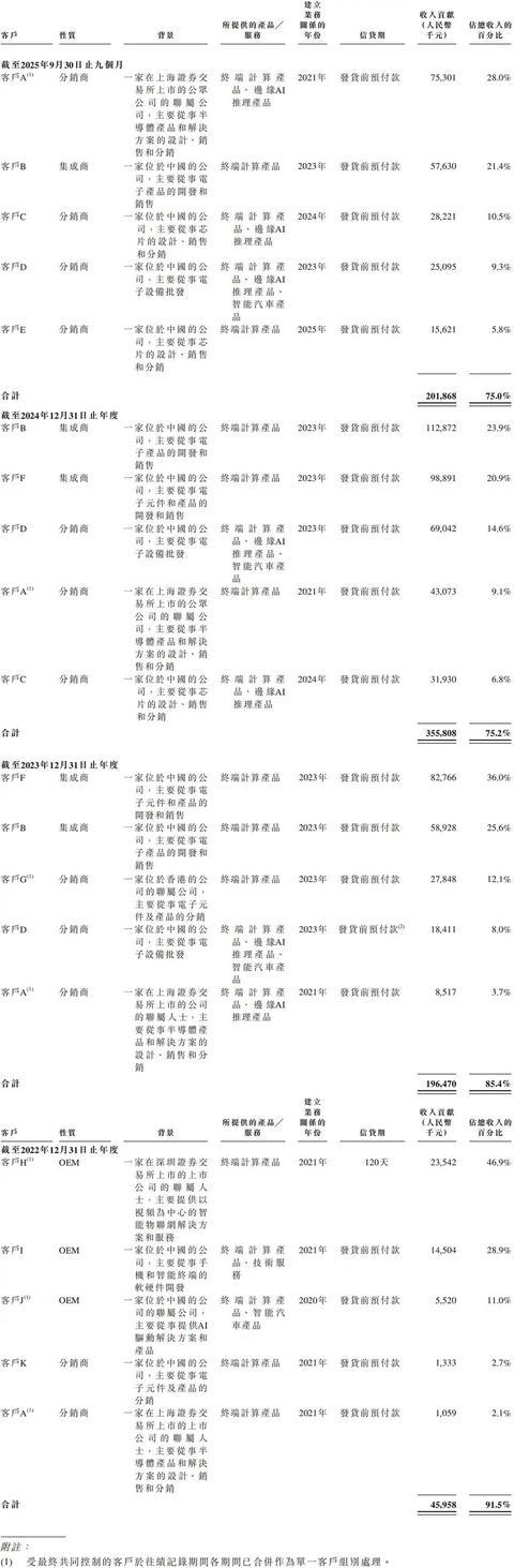 2022年、2023年、2024年、2025年1-9月,前五大客户产生的收入分别占爱芯元智总收入的91.5%、85.4%、75.2%、75.0%。