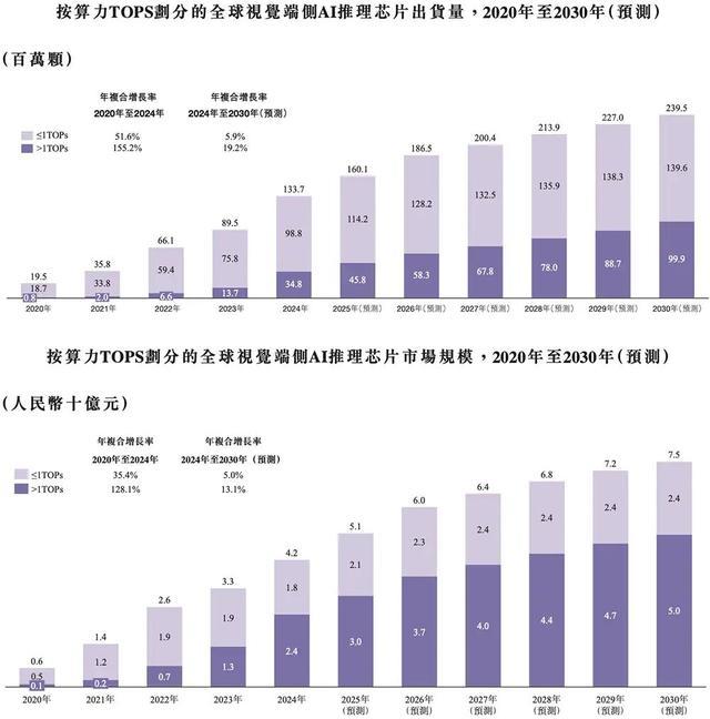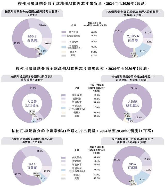 根据招股书,端侧AI推理芯片的应用场景涵盖个人设备、智能汽车、信息系统等领域,这些细分市场预计到2030年将在全球市场实现54.4%、48.9%及19.7%的出货量年复合增长率,在中国市场有望以更高增速发展,分别达到59.9%、55.3%、22.5%。