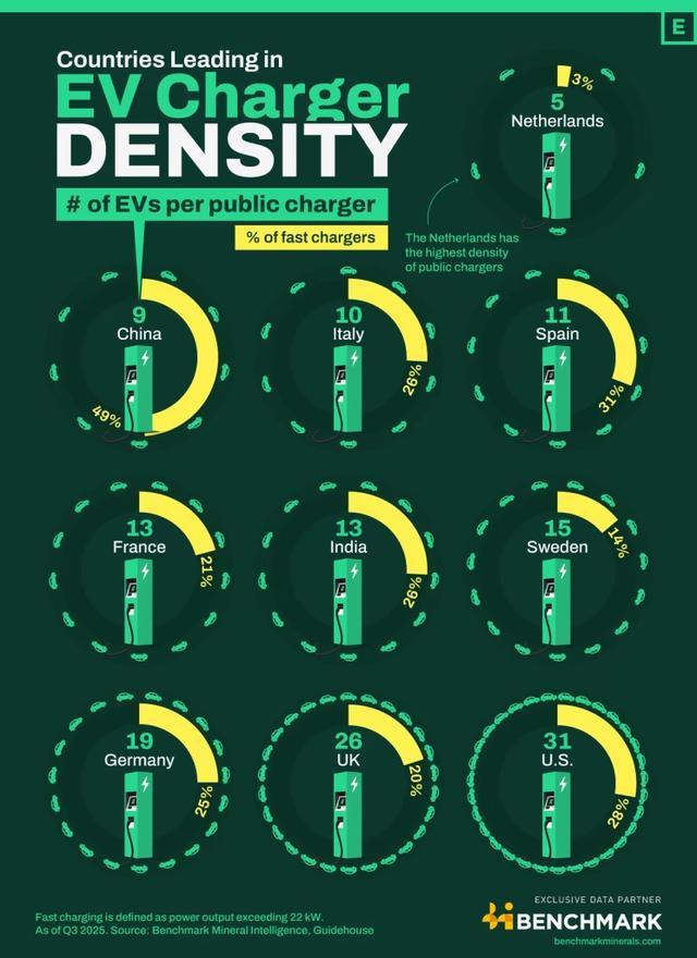 根据 BenchmarkMineralIntelligence 的数据,荷兰以绝对优势位居榜首,车桩比为 5:1,即平均每 5 辆电动汽车共享一个公共充电桩。然而,荷兰的快充桩占比较低,仅为 3%。