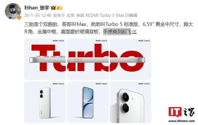 IT之家 1 月 26 日消息,小米 REDMI 手机市场经理张宇今日发文透露,REDMI Turbo 5 系列共两杯,包括 Max 和标准版。其中,标准版采用 6.59″ 黄金中尺寸设计,拥有超大 R 角 + 金属中框 + 雾面磨砂玻璃背板,号称“手感爽到起飞”。