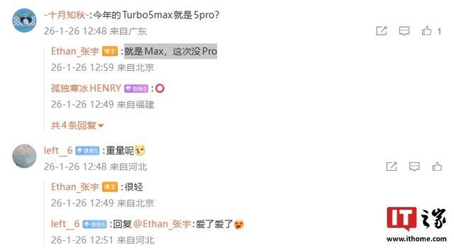 IT之家注意到,有网友询问今年的 REDMI Turbo 5 Max 是否就是 5 Pro,张宇表示:“就是 Max,这次没 Pro。”