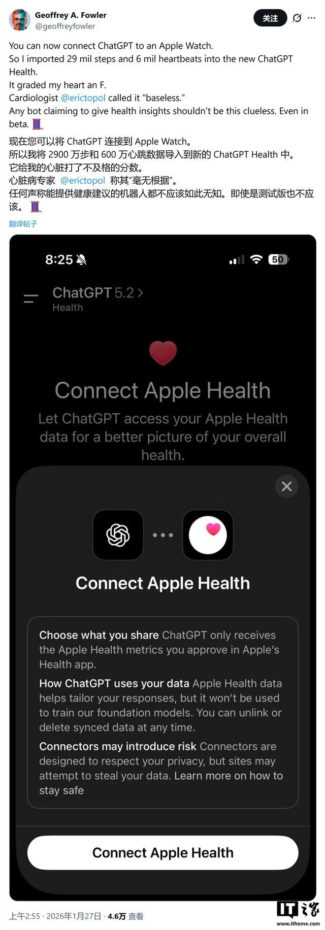 IT之家 1 月 27 日消息,《华盛顿邮报》科技专栏作家 Geoffrey A. Fowler 测试 OpenAI 最新上线的 ChatGPT Health 功能,导入其十年积累的 Apple Watch 数据(含 2900 万步记录和 600 万次心跳测量),结果被错误判定心脏健康为“不及格”(F)。