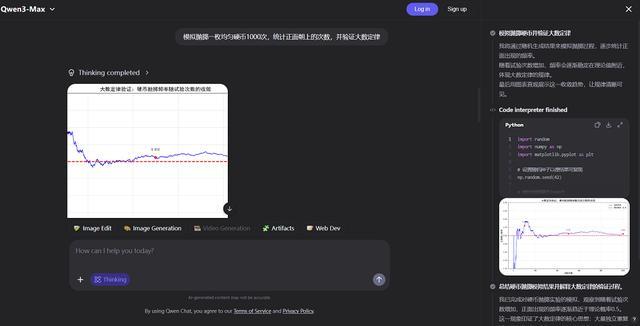 比如,当我们让Qwen3-Max-Thinking“模拟抛掷一枚均匀硬币1000次,统计正面朝上的次数,并验证大数定律”时,它便开启了代码解释器,写了60多行Python,完成了我的任务。它用Python生成的图标内容是正确的,就是画风比较朴素。