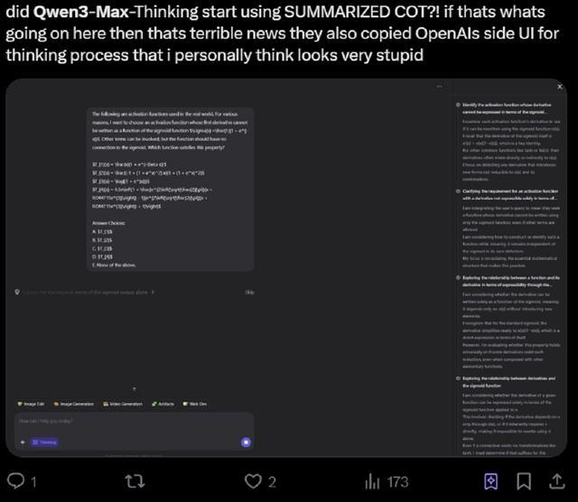 X平台上,也有网友已经尝试了Qwen3-Max-Thinking的推理能力。不过,需要注意的是,Qwen3-Max现在已经隐藏了完整的思维链路径,转而提供思维链总结,有些网友对此表示不接受。