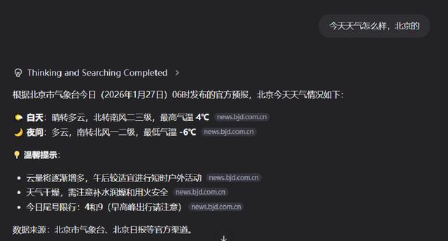 其实自适应进行搜索的能力已经比较常见了。无论是DeepSeek、ChatGPT,都可以在一些明显涉及即时信息的查询中主动搜索。Qwen3-Max-Thinking也一样,比如,当问及今天的天气时,它便会主动搜索,给出准确回答。