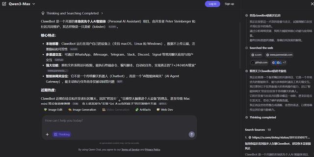 对于一些并没有明显时效性提示的内容,Qwen3-Max-Thinking也可以自主调用搜索。比如,我们向它提问“Clawdbot是啥”,模型先思考了一会儿发现没有相关知识,然后就开始搜索,并给出完整介绍。