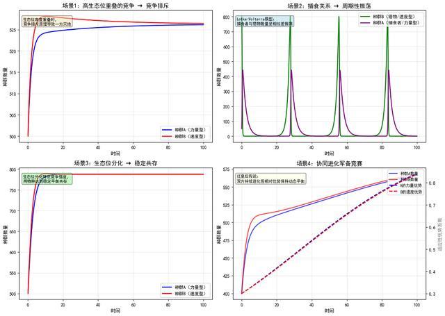 提示词:有两个种群,种群a注重力量的发展,种群b注重速度的发展,请模拟一下两个种群之间的相互作用并给出说明。