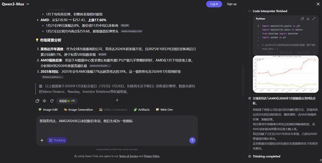 在下方任务中,Qwen3-Max-Thinking需要查询英伟达、AMD 2026年以来的股价变动,然后生成一张图表。检查思考过程和代码后,可以发现Qwen3-Max-Thinking虽然进行了搜索,但搜索方式有些“东一榔头西一棒槌”,找了许多不同的来源,也没能找到所有日期的股价情况。