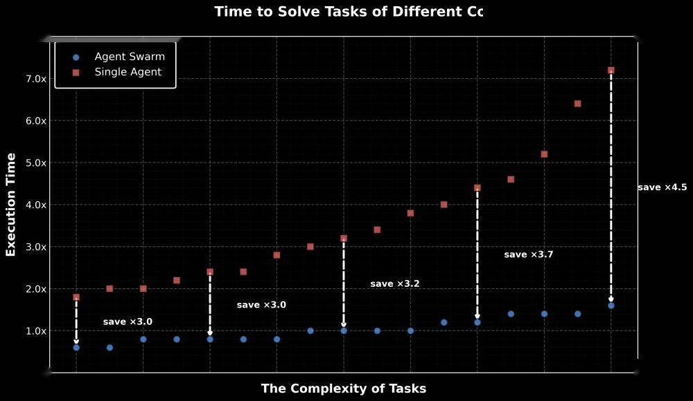 K2.5 Agent集群通过并行、专门化的执行方式能够提升复杂任务的性能。在Kimi团队内部评估中,其能够将端到端运行时间缩短80%,同时支持更复杂、更长期的工作负载。