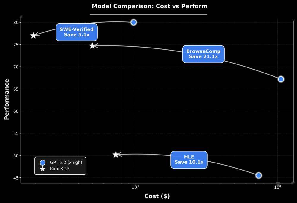 在Agent基准测试HLE、BrowseComp和SWE-Veried中,K2.5与GPT-5.2(xhigh)相比,在性能逼近的同时成本更低。