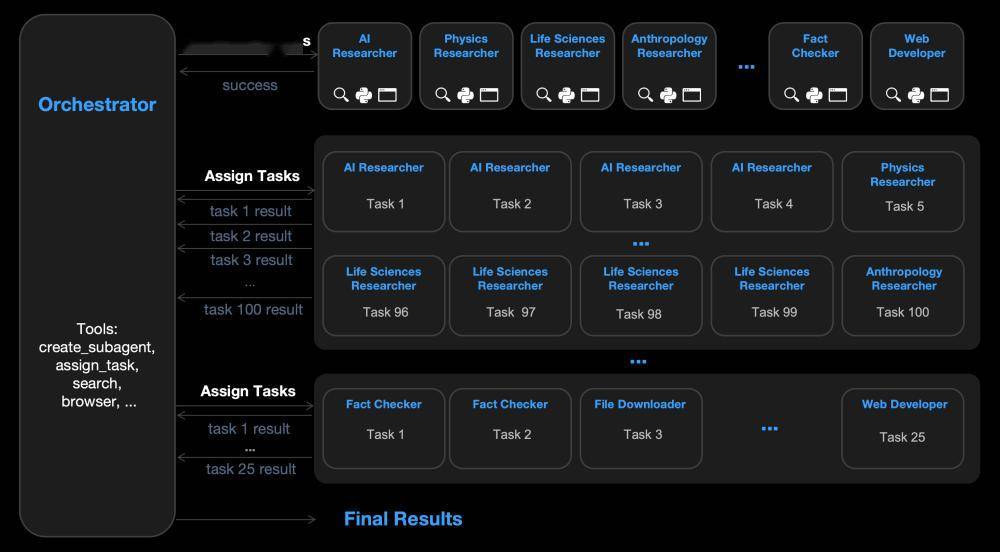 通过并行智能体强化学习(PARL)训练,K2.5模型学会了自主调度最多100个子智能体组成的集群,并行执行最多1500个协调步骤的工作流,整个过程无需预定义角色或人工设计工作流。