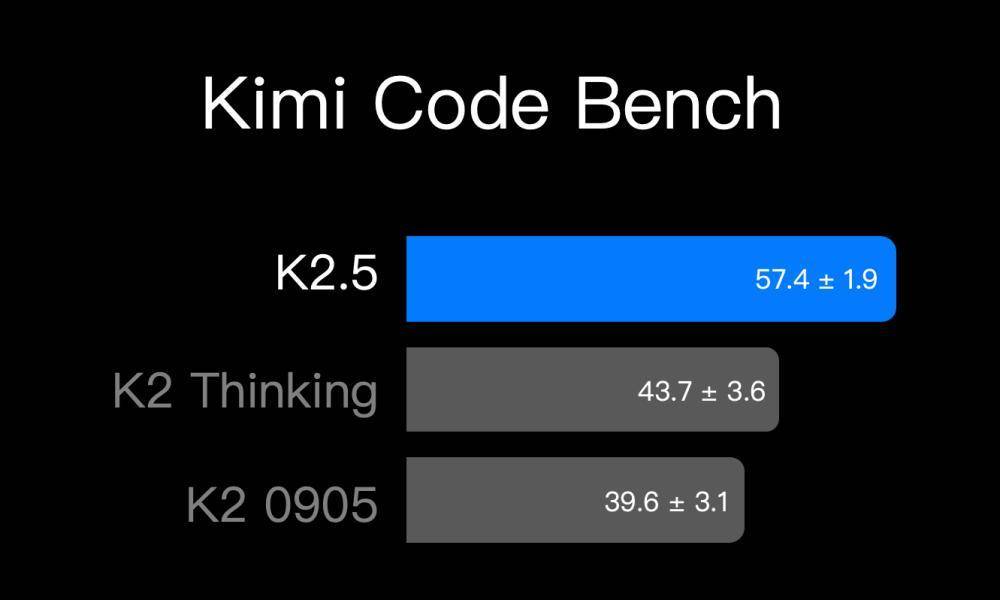 在Kimi团队内部编程基准测试集Kimi Code Bench中,K2.5在多语言环境下从构建、调试、重构、测试到脚本编写的端到端任务上均较K2有所增强。