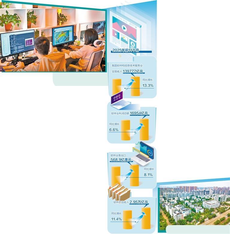 工业和信息化部数据显示,2025年前11个月,我国软件和信息技术服务业(以下简称“软件业”)运行态势良好,实现收入139777亿元,同比增长13.3%;软件业利润总额16954亿元,同比增长6.6%;软件业务出口568.9亿美元,同比增长8.1%,增速连续9个月保持正增长。