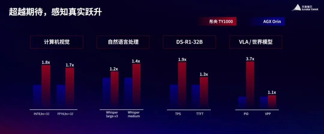 据透露,彤央全系列产品的标称算力均为实测稠密算力,覆盖 100T 到 300T 范围。在计算机视觉、自然语言处理、DeepSeek 32B 大语言模型等多个场景的实测中,彤央 TY1000的性能全面优于英伟达AGX Orin。“彤央系列产品兼具高算力、成熟生态、灵活可拓展的核心优势,是连接AI与物理世界的最佳载体。我们的目标是成为国内边端大算力领域的领军者”,郭为说。