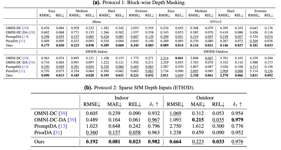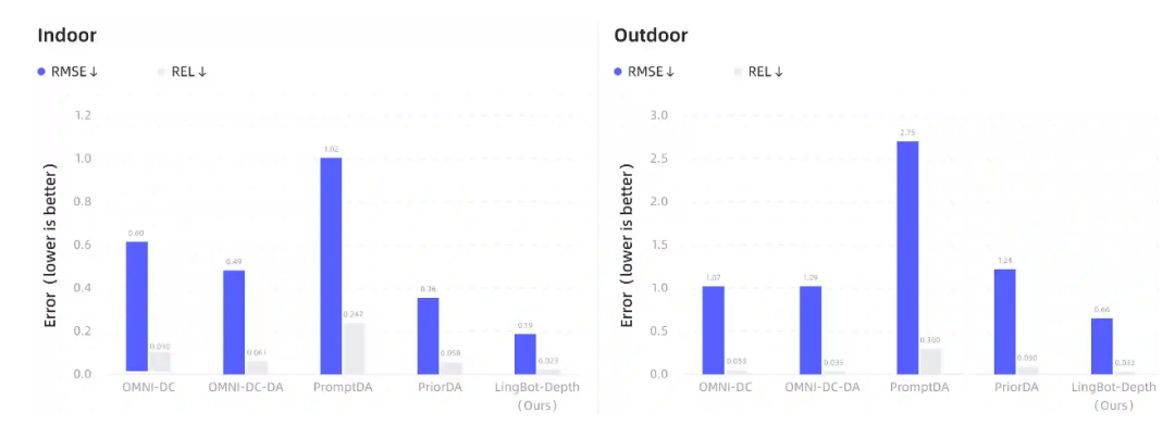 在NYUv2、ETH3D等主流3D视觉基准评测中,相较于PromptDA、PriorDA等业界主流深度补全模型,LingBot-Depth在室内场景下相对误差(REL)降幅超70%,在高挑战性的稀疏SfM任务中,均方根误差(RMSE)也降低约47%。