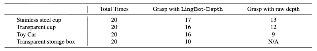 对于机器人而言,其在抓取透明、反光物体时时常会出现判断失误的情况。测试结果显示,LingBot-Depth模型透明收纳箱抓取成功率从0%提升至50%,同时在多种反光和透明物体上提升了30%~78%的抓取成功率。