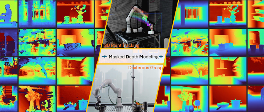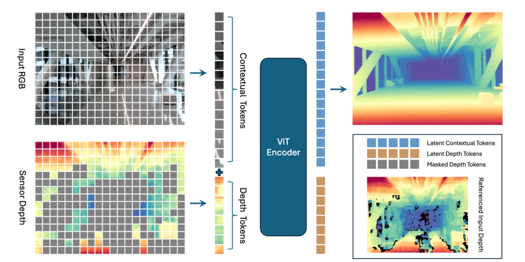 结合该RGB-D语料库,研究人员采用掩码深度建模方式对ViT-Large模型进行预训练,通过注意力机制将度量几何信息融入语义标记,可有效提升RGB-D相机的空间感知质量。