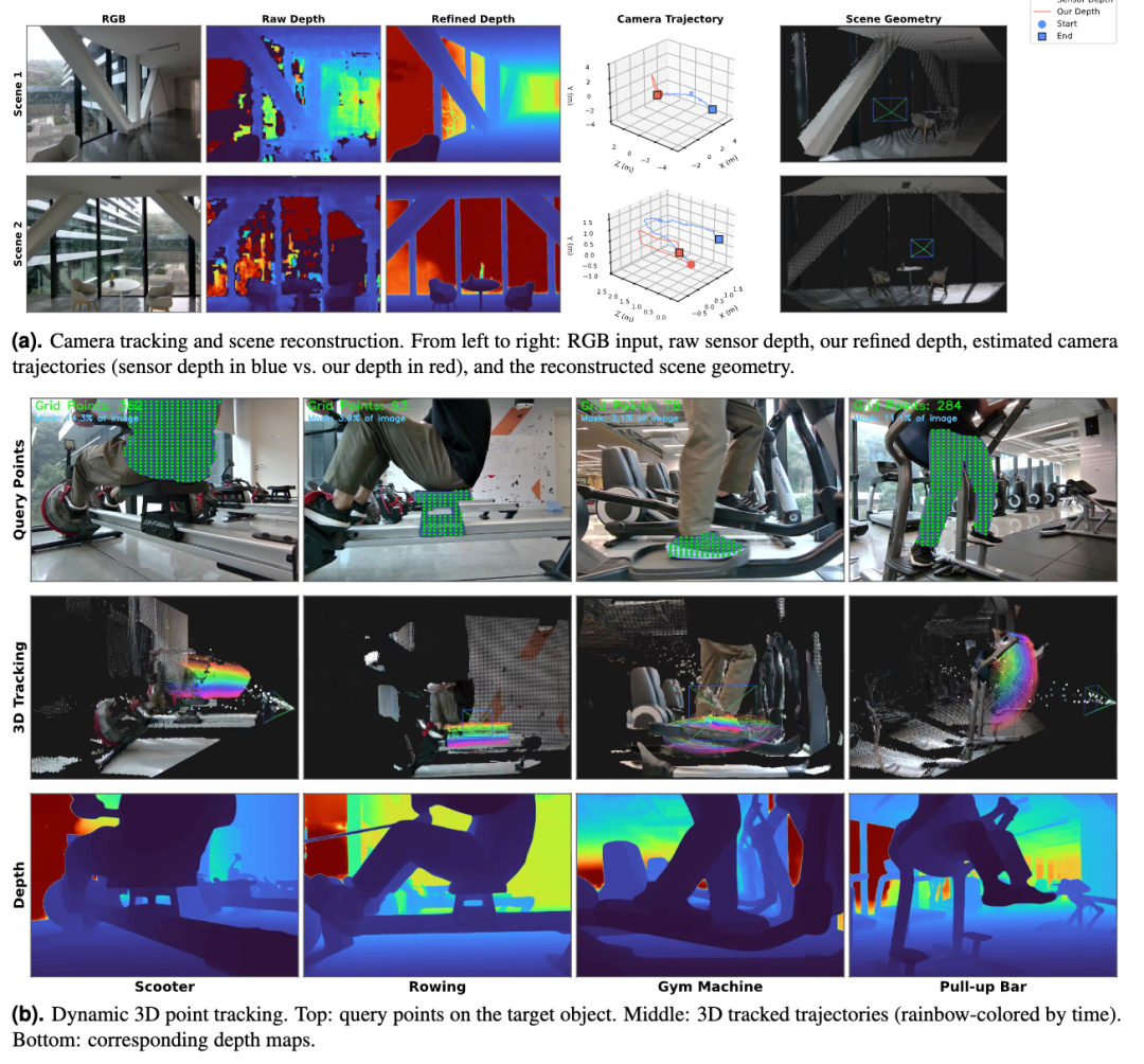 可以看到在3D点跟踪案例中,当场景包含大面积的玻璃时,原始深度传感器会严重失效,经LingBot-Depth模型优化后的深度数据,能够生成更加平滑和精确的相机轨迹。
