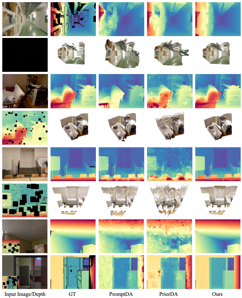 在稀疏摄影测量(SfM)深度输入法设置下,LingBot-Depth模型生成的深度图具备更清晰的深度边界和更连贯的结构特征,并且在遮挡严重或观测信息稀疏的区域优势更为明显。