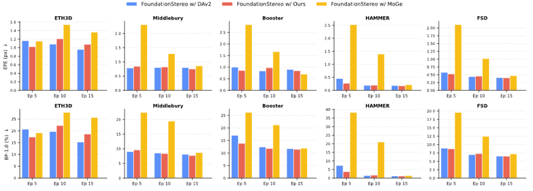 研究人员还将LingBot-Depth模型,作为强单目深度先验融入FoundationStereo模型中,结果显示加速双目匹配模型训练后,FoundationStereo收敛更快。