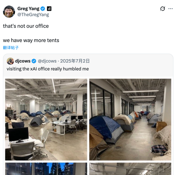 关于xAI的成员有多拼,曾经有一个传言。去年7月,有人发布了几张照片,照片中办公室里到处都搭着帐篷,发布者声称那是xAI的盛况。