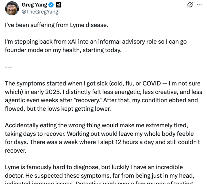 但是杨格认为,这其实是“因祸得福”——要不是xAI高强度的工作,也不会早早发现自己有莱姆病。早早发现了,就可以早早治疗,而早治疗的效果会更好。