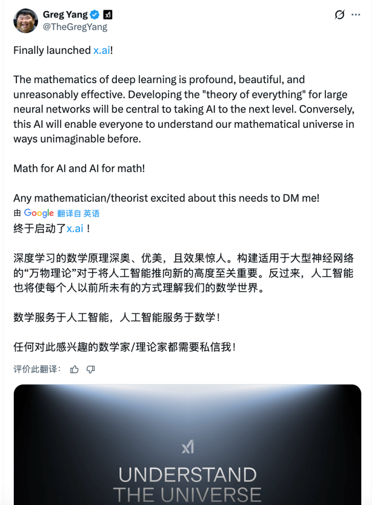 xAI的联合创始人之一杨格(Greg Yang)发布的消息震惊了所有人——