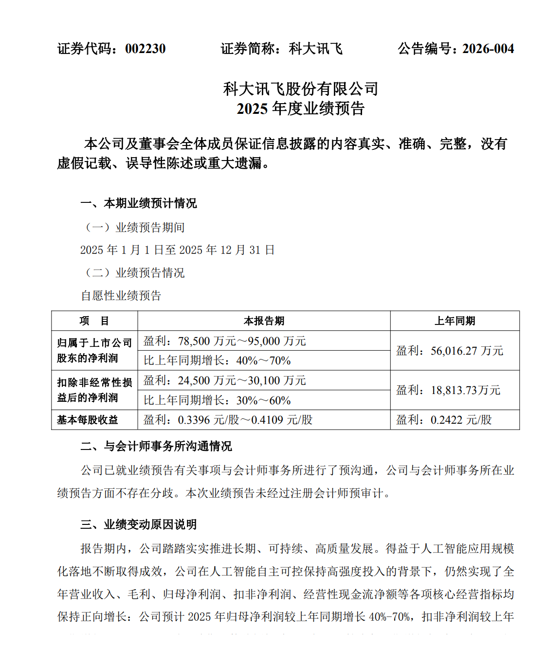 凤凰网科技讯 1月28日,科大讯飞发布2025年度业绩预告。预计2025年归属于上市公司股东的净利润为7.85亿元-9.50亿元,比上年同期增长40%-70%。