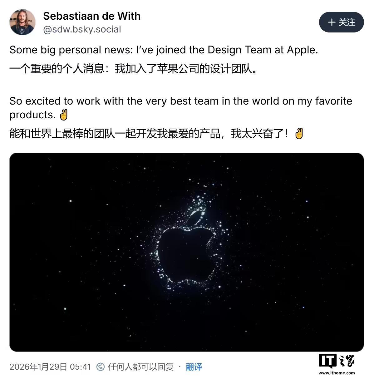 IT之家 1 月 29 日消息,专业相机应用 Halide 的联合创始人塞巴斯蒂安 · 德 · 威斯(Sebastiaan de With)昨日(1 月 28 日)宣布,将重返苹果并加入其核心设计团队(Design Team)。