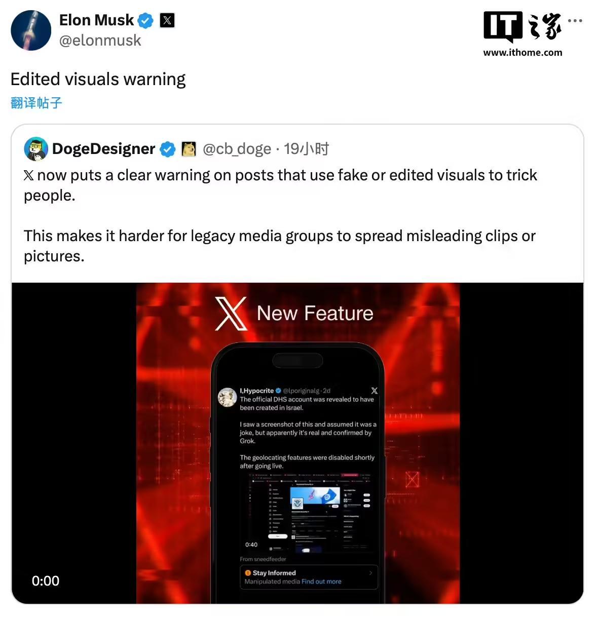 IT之家 1 月 29 日消息,TechCrunch 今日报道,埃隆 · 马斯克在其社交平台 X 上转发了一条由匿名账户“DogeDisigner”发布的推文,并附言“已编辑视觉内容警告”,此举被外界视为 X 即将推出标注平台上的“被操纵媒体”(Manipulated Media)。