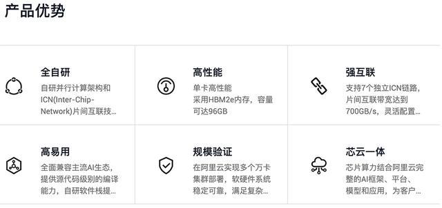 平头哥官网列出了真武810E的六大优势:全自研、高性能、强互联、高易用、规模验证、芯云一体。