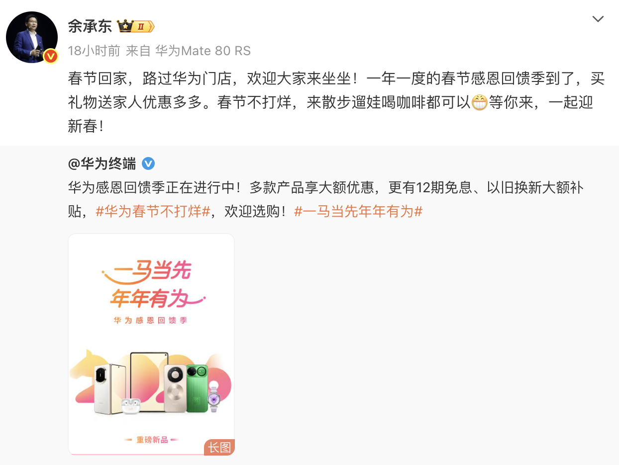 界面新闻获悉,华为于1月29日至2月28日启动新年促销活动,手机、平板、智能穿戴等全品类产品同步降价,最高优惠可达4000元。华为常务董事、终端BG董事长余承东也在其微博上转发了相关促销信息。
