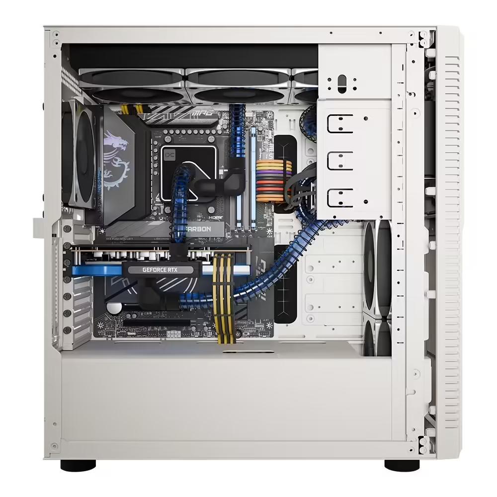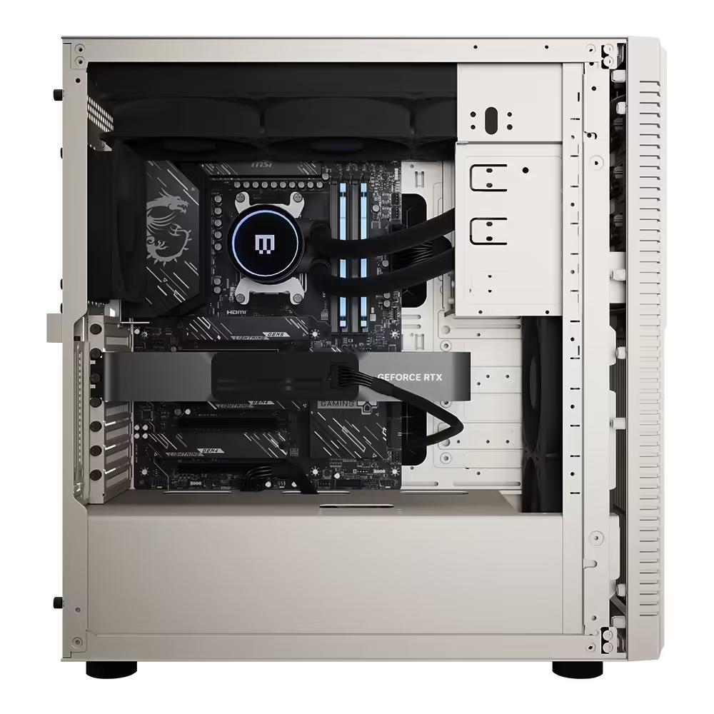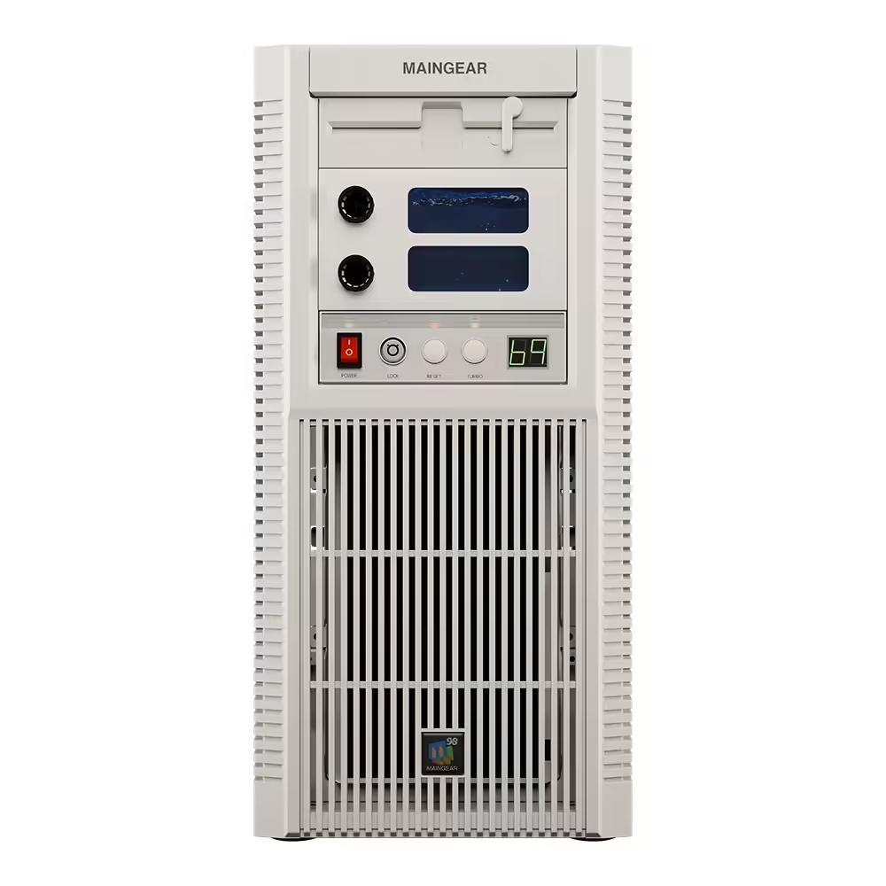 散热方面,标准版配备了 MAINGEAR EPIC 360mm 一体式水冷,而顶配版则采用了 Alphacool 联合开发的开放式分体水冷系统,包含双冷排与镀铬风扇,完美压制顶级硬件的热量。