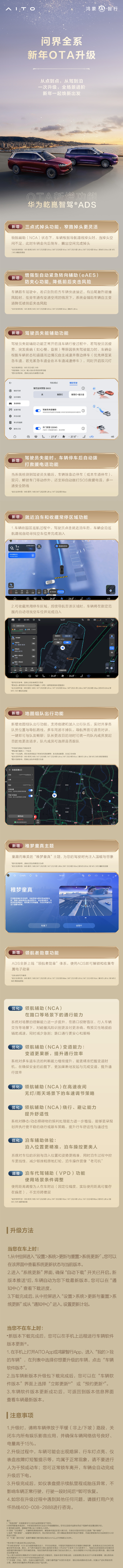 凤凰网科技讯 1月30日,问界全系车型近日开启新年OTA升级,共涉及超过40项功能更新,涵盖华为乾崑智驾ADS与鸿蒙座舱两大系统。