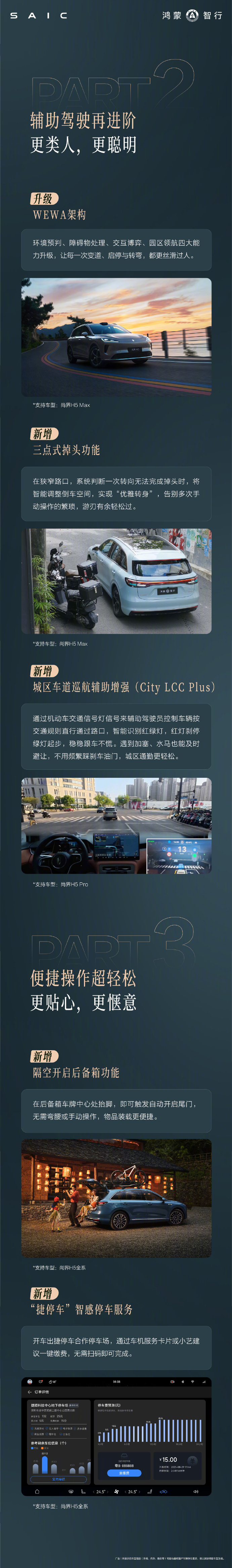 同时,系统新增预碰撞自动升窗、增强型自动紧急转向辅助(eAES 2.0)及紧急转向辅助。在便利性上,提供了就近泊车、三点式窄路掉头、无麦K歌、隔空开启后备箱等功能,并接入了“捷停车”“平安好车主”等第三方服务。