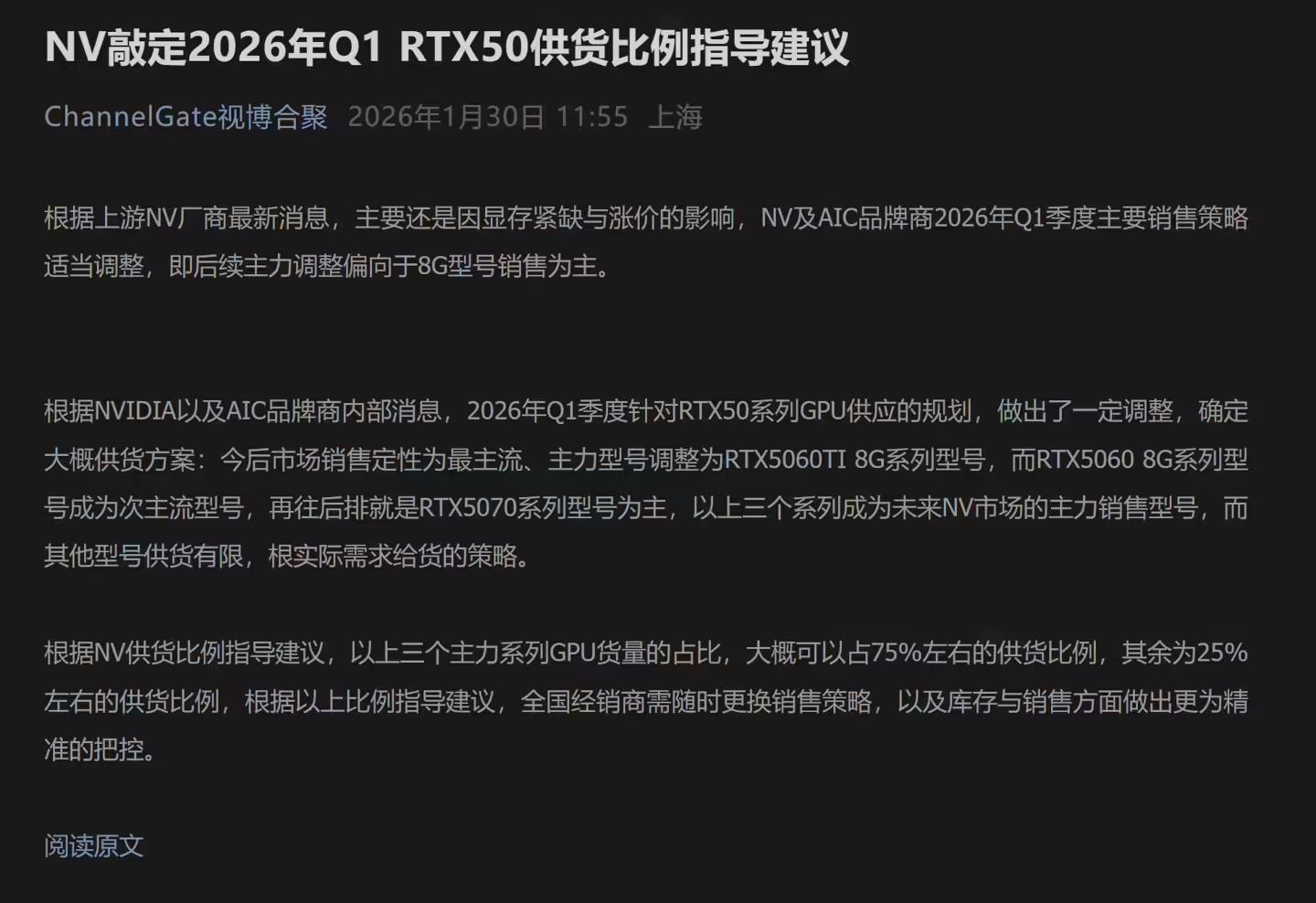 IT之家 1 月 30 日消息,博板堂旗下公众号“ChannelGate 视博合聚”今天发文称,根据上游厂商最新消息,英伟达以及 AIC 品牌商将对今年第一季度的主要销售策略做适当调整,主要偏向于 8GB 显存型号。