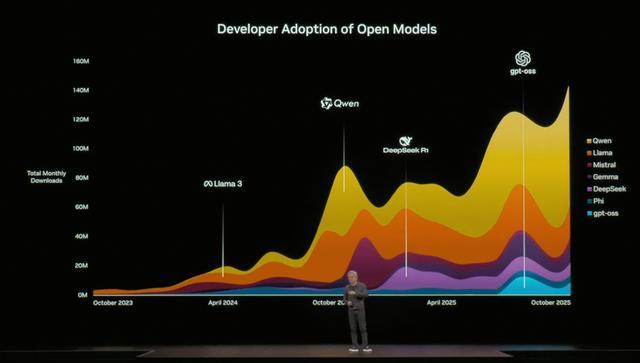 在更具体的层面,全球开发者基于千问的衍生模型每天新增超200个,涵盖机器人控制、代码生成、漫画后期制作、多语种翻译等多个方向。其中5款小尺寸模型在2025年12月的单月下载量便已超越Mistral、OpenAI、英伟达等6家国际领先AI厂商旗下所有开源模型当月下载量的总和。