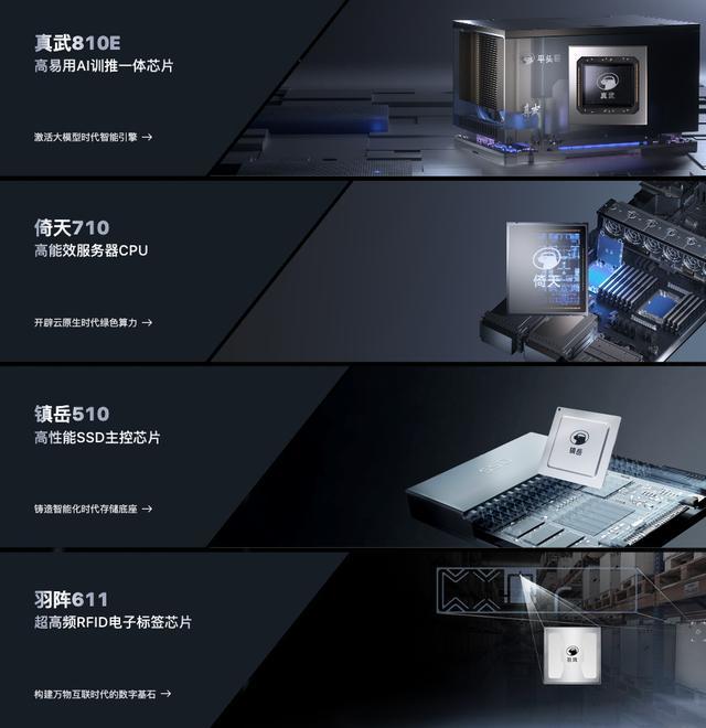 其已推出AI推理芯片含光800、训推一体AI加速芯片真武810E、Arm服务器CPU倚天710、高性能SSD主控芯片镇岳510、超高频RFID电子标签芯片羽阵611和羽阵600等芯片。
