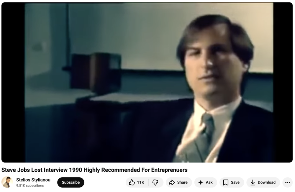 1990年,史蒂夫·乔布斯(Steve Jobs)穿着宽大的西装,接受了一次长达52分钟的访谈。不过,这段录像带后来在运输中丢失,直到2011年他去世后才被找回,被称为“遗失的访谈”(The Lost Interview)。