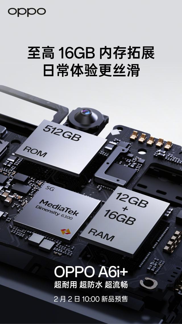 据介绍,OPPO A6i+ 配备 7000mAh 六年长寿大电池,号称“一充用一天,一块顶六年”。此外,该机还搭载 IP69 满级防水,提供至高 16GB 内存拓展。官方海报显示,该机搭载联发科天玑 6300 处理器。
