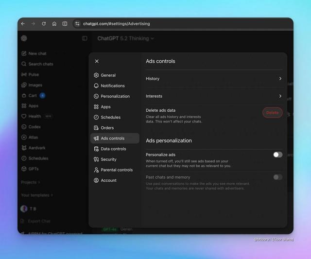 此外,OpenAI 在设置中新增了专属的“广告控制”页面,用于管理广告相关记录和兴趣偏好。用户可在该页面删除广告相关数据,且不会影响原有对话记录,还能开启或关闭广告个性化推荐。但需要注意的是,即便关闭个性化推荐,当前的对话内容仍可能影响广告的展示类型。