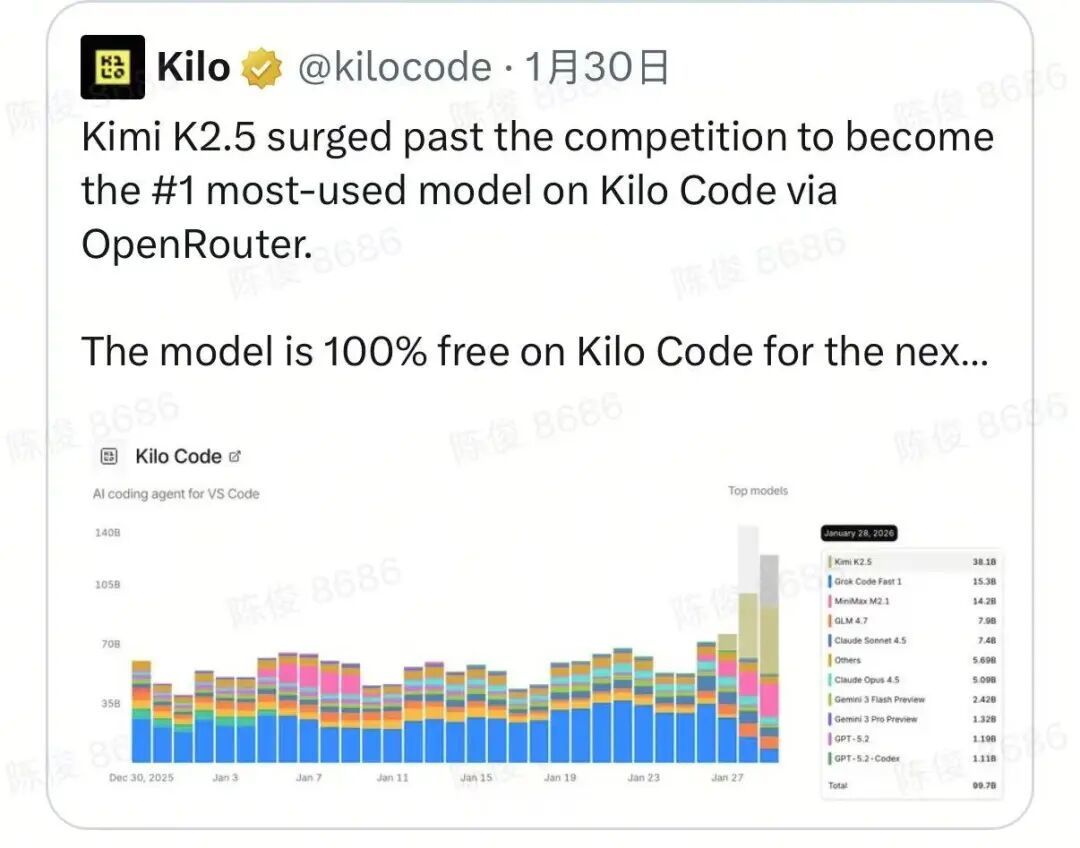 成为通过OpenRouter在Kilo上使用最频繁的模型。更猛的是,Kilo随即宣布该模型在其平台上将完全免费。